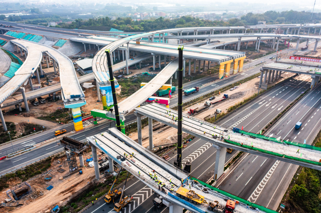 该互通最大高度约30米,占地面积约700亩,相当于60个标准足球场,采用全涡轮复合式布局,由1条主线和12条匝道“揉合”而成,并与既有肇花高速4处桥梁拼宽,需历经20余次的上跨下穿。工程施工难度大、技术复杂,多项关键工序在国内同类枢纽互通建设中少有先例,具有挑战性。